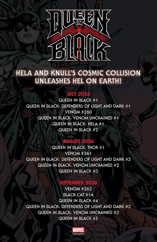 New York, NY— April 16, 2026 — HELA and KNULL, two of the most powerful evils in the Marvel Universe are at war, and Earth is the final prize! Be there when their cosmic collision unleashes HEL ON EARTH in QUEEN IN BLACK, a new comic book event by Al Ewing and Iban Coello. The debut hits stands on July 1 and will be the latest Marvel Comics launch available to purchase in TRUE BELIEVERS BLIND BAGS. QUEEN IN BLACK #1 TRUE BELIEVERS BLIND BAGS will only contain exclusive variant covers not available for regular ordering. Today, fans can check out all-new covers for QUEEN IN BLACK #1, both regular open-to-order covers and blind bag exclusives.