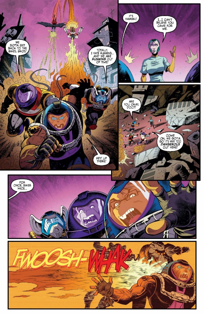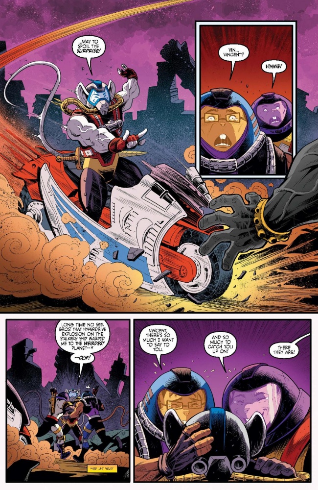 On sale in comic shops everywhere tomorrow, the final issue (for now!) of the Biker Mice’s high-octane ongoing series reveals the coming of outrageous anti-hero called Scorch – courtesy of out-of-this-world Matt Hotson (Power Rangers: The Return) and Jordi Tarragona (Hal Jordan and the Green Lantern Corps) – as Throttle, Modo, and Vinnie rocket into their strangest mission yet! The Biker Mice have blasted into the most bizarre corner of the galaxy—the villainous Lectromag’s sprawling deep-space stronghold known only as the Merge! Still reeling from the loss of their best bro, Throttle and Modo must push past their grief . . . but the Plutarkians aren’t giving them time to breathe. With a galaxy-wide bounty on their heads, every mercenary from here to the Large Magellanic Cloud is out for their tails!