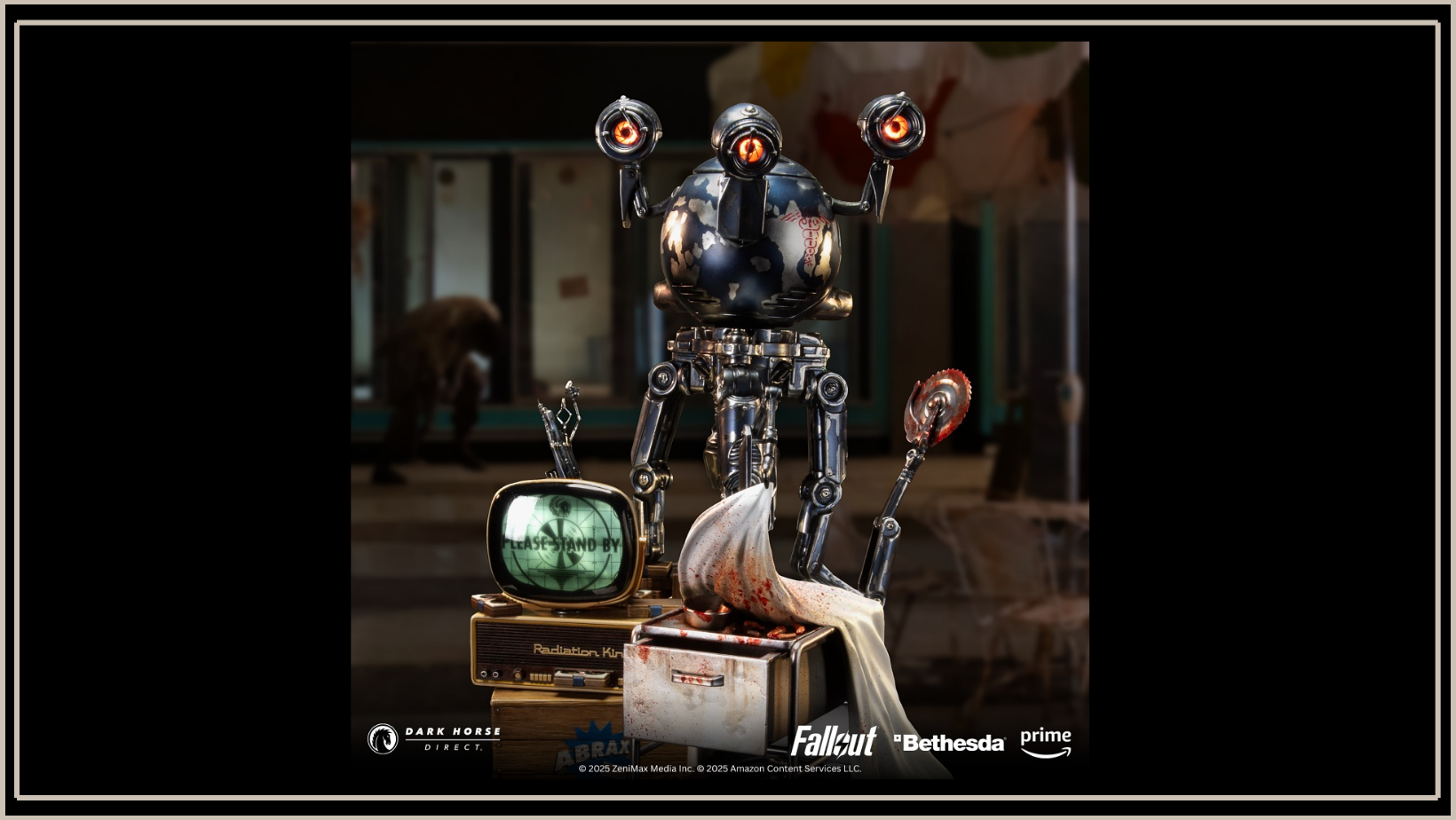 Snip-Snip is depicted gingerly lifting up a sheet, revealing his surgical tools and bloody remains of previous victims patients. Standing at 14.25” tall and on a 11.25” wide base reminiscent of the Super Duper Mart flooring. On the Mr. Handy “Snip-Snip” Statue, detailed and sculpted by Substance Model Works, Snip-Snip’s eyes and TV monitor light up, and the statue includes 7 voice lines as delivered by voice actor Matt Berry. Display the sights and sounds of Fallout when the VHS tape is pressed on the VCR to control the TV and lights.