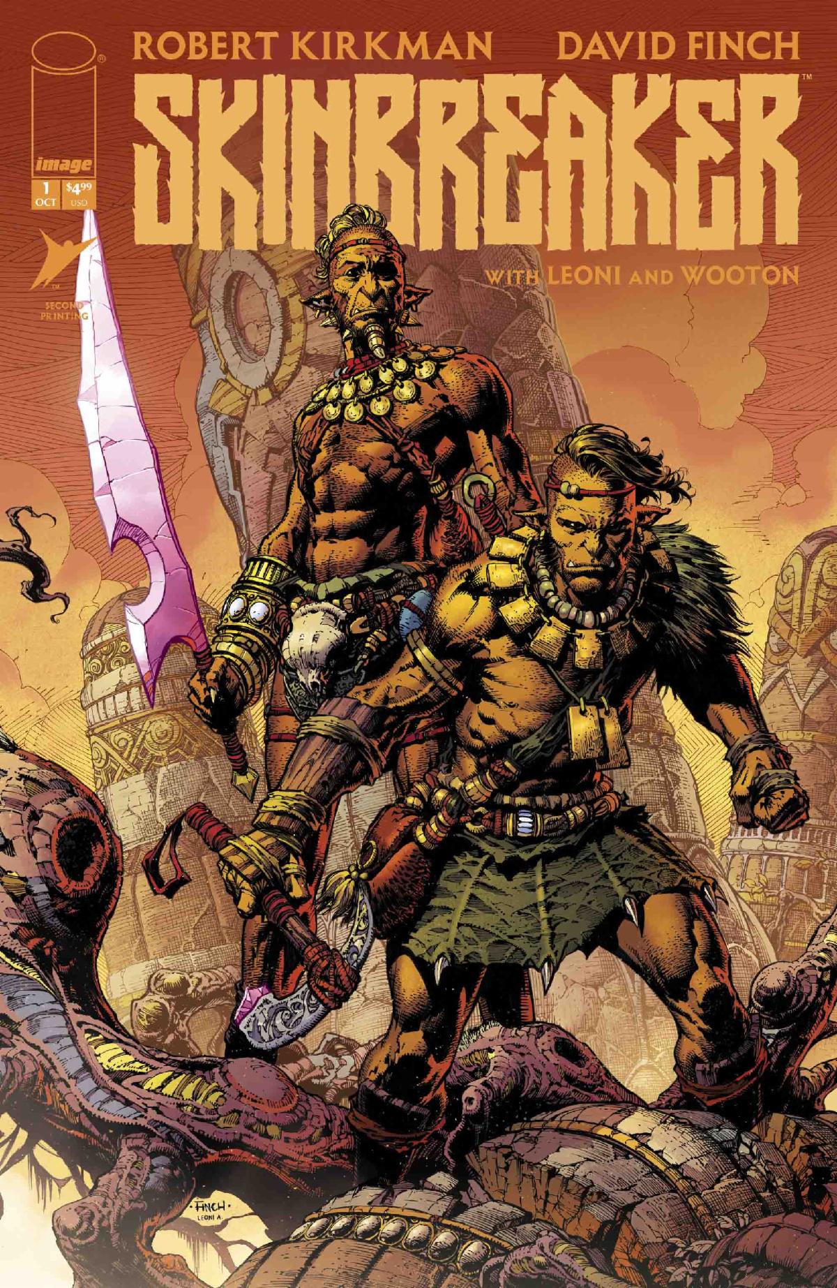 | LOS ANGELES 09/29/2025 — Today Skybound and Image Comics announced that the all-new comic book series Skinbreaker from the creative dream team of writer Robert Kirkman (Invincible, The Walking Dead), artist David Finch (Batman, New Avengers), colorist Annalisa Leoni (Invincible Universe: Battle Beast), and letter Rus Wooton (TRANSFORMERS), has sold out at the distributor level and will return with a new printing for both the standard and treasury editions on October 29, 2025. The second printing includes a newly recolored main cover by David Finch & Annalisa Leoni, as well as a brand-new cover by Jorge Corona (TRANSORMERS) for the standard edition. The treasury edition, which captures the grandeur of David Finch’s art in a 10” x 14” oversized format on deluxe newsprint, will be reprinted with the treasury-format version of the original issue’s Cover G by David Finch & Annalisa Leoni. “I’m always so thrilled when I see this industry supporting new ideas!” said Robert Kirkman. “David and I are extremely gratified to see the response to this series. We can’t wait for people to see more of the world of Skinbreaker.” Skinbreaker tells the story of a people on the verge of collapse and their fight for survival as the many threats they face close in for the kill. Enor has led his tribe for many seasons, but his time as Chieftan is coming to an end. He wields the mighty SKINBREAKER, but at his age, he can barely lift it. Will Enor’s reluctant heir, Anok, take over before their world falls to ruin? As a bloody power struggle begins, an even bigger threat lurks in the darkness beyond their village. Skinbreaker #1 Second Printing (Lunar Codes Below | SRP: $4.99) will be available at comic book shops and digital platforms including Amazon Kindle, Apple Books, and Google Play on Wednesday, October 29, 2025. The full list of covers is below: Skinbreaker #1 Second Printing Cover A by David Finch & Annalisa Leoni (Lunar Code: 0825IM8384) Skinbreaker #1 Second Printing Cover B by Jorge Corona (Lunar Code: 0825IM8385) Skinbreaker #1 (of 8) Treasury Edition Second Printing by David Finch & Annalisa Leoni (Lunar Code: 0825IM8386 | SRP: $14.99) will be available at comic book shops on Wednesday, October 29, 2025. |
